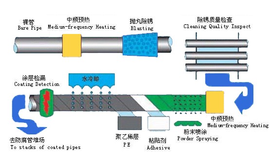 3PE主要指管道有三層PE防腐結(jié)構(gòu):第一層環(huán)氧粉末(FBE>80um),第二層膠粘劑(AD)170~250um,第三層聚乙烯(PE)1.8~3.7mm。三種材料融為一體,并與鋼管牢固結(jié)合形成優(yōu)良的防腐層!